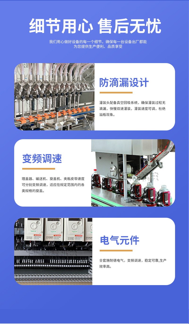 3、灌装阀采用优质灌装阀,下料速度快,灌装量精准,且无滴漏现象产生。