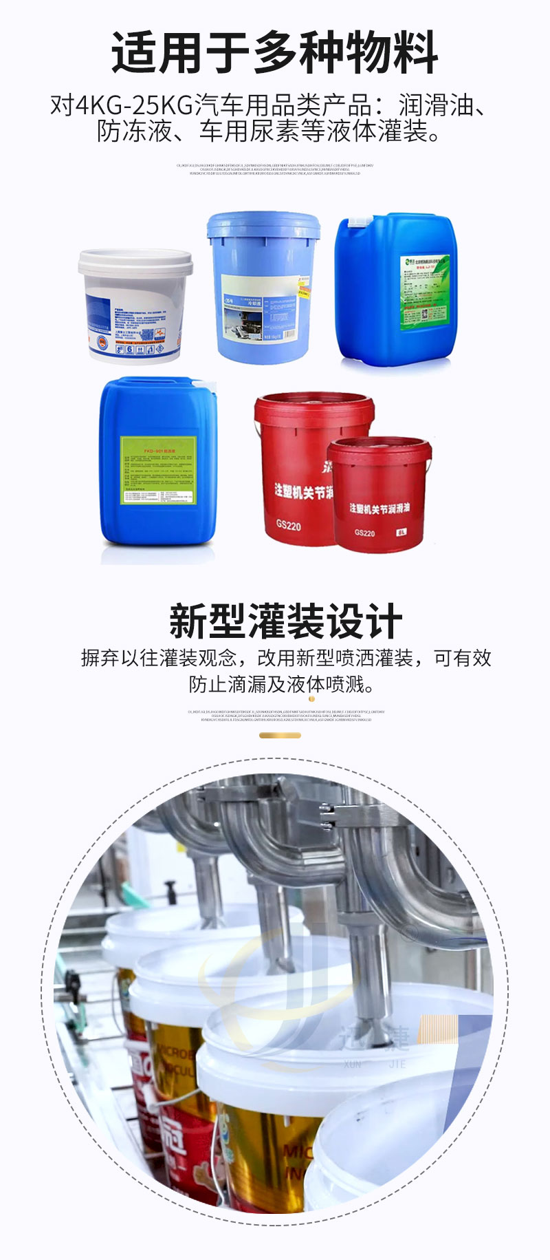 全自动称重式灌装机适用于多种物料,对4kg-25kg汽车用品类产品:润滑油、防冻液、车用尿素等液体灌装。