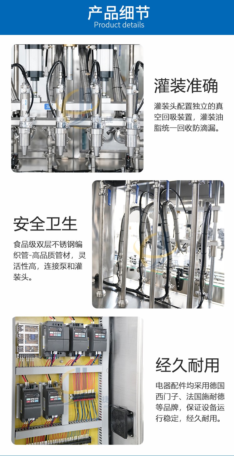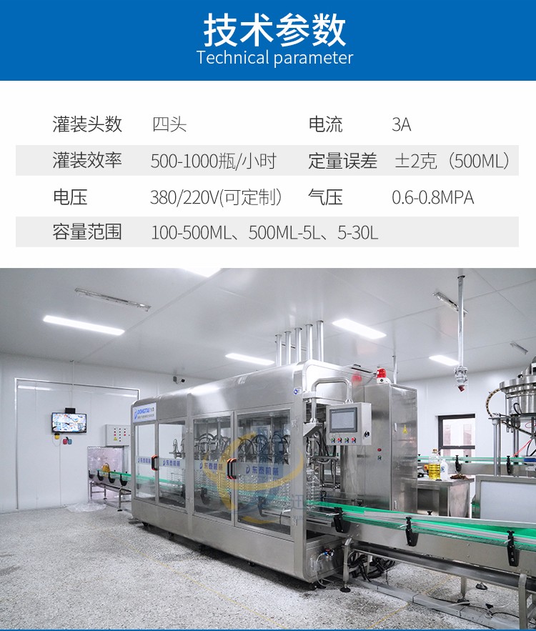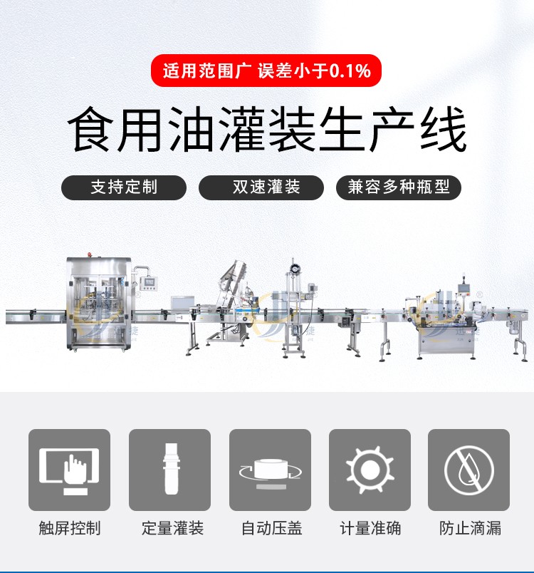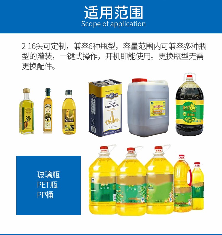 食用油灌装生产线2-16头可定制,兼容6种瓶型,容量范围内可兼容多种瓶型的灌装,一键式操作,开机即能使用。