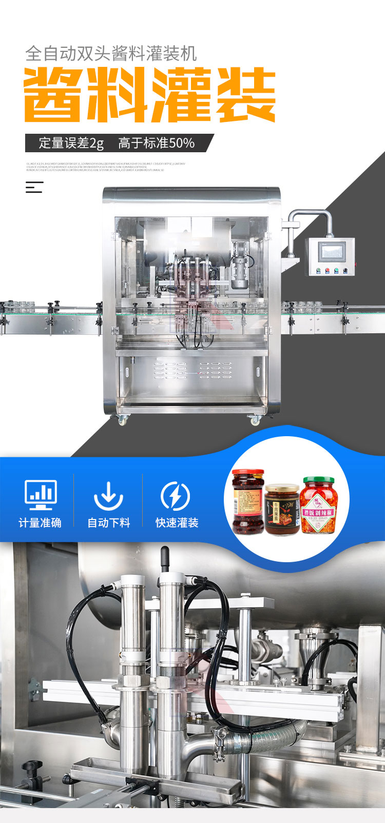 双头酱料灌装机适用于调味品中带颗粒并且浓度较大的香菇酱、豆瓣酱、花生酱、芝麻酱、果酱、牛油火锅底料等酱类的灌装。