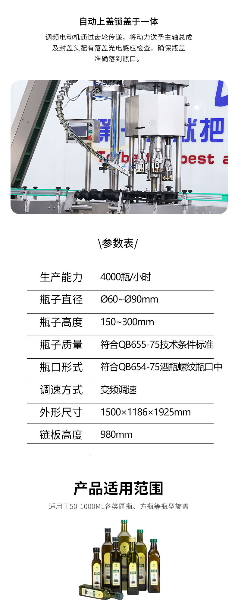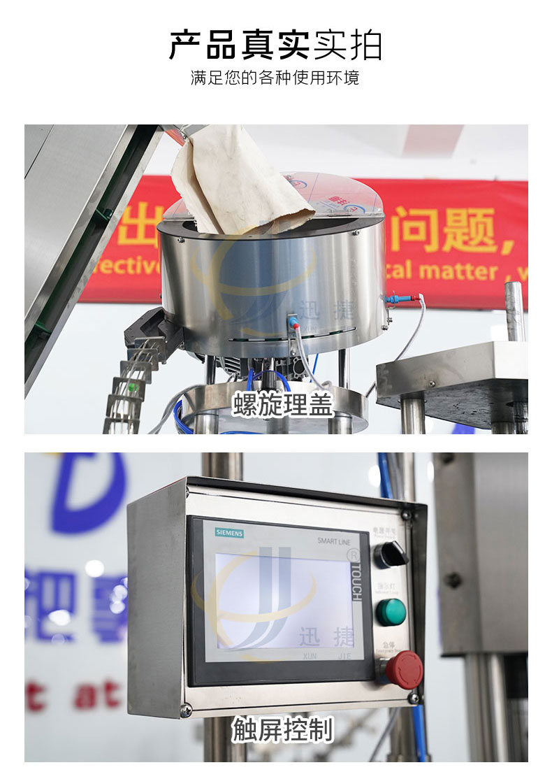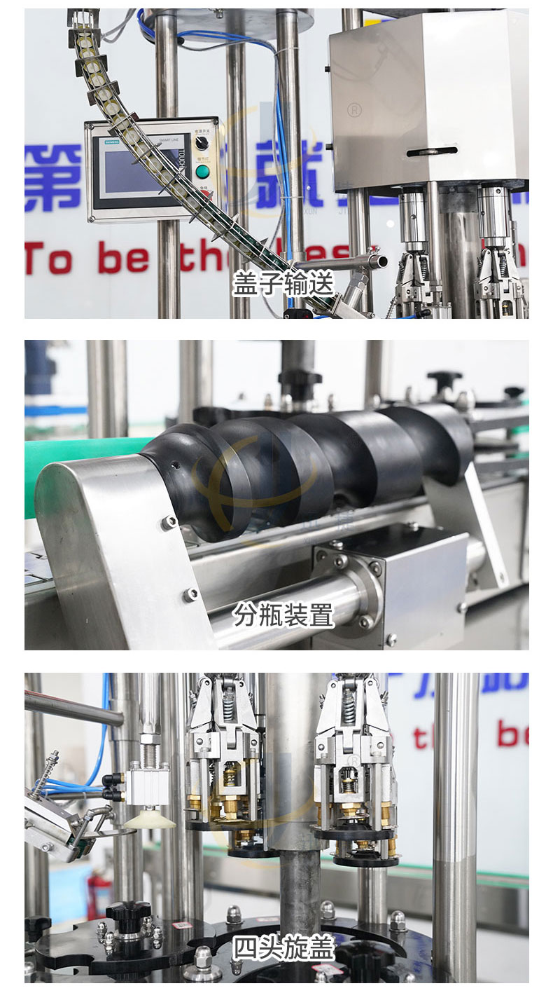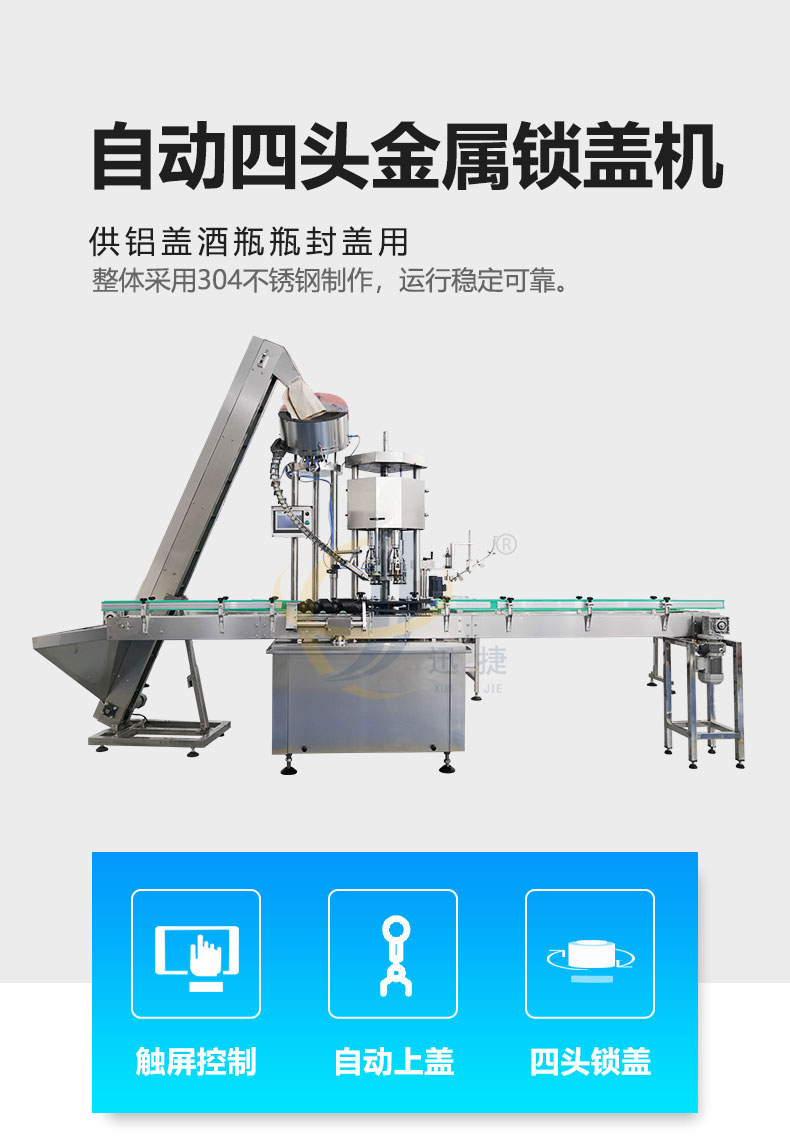 全自动四头金属锁盖机供铝盖酒瓶瓶封盖用,整体采用304不锈钢制作,运行稳定可靠。适用于50-100ml各类圆瓶、方瓶等瓶型旋盖。