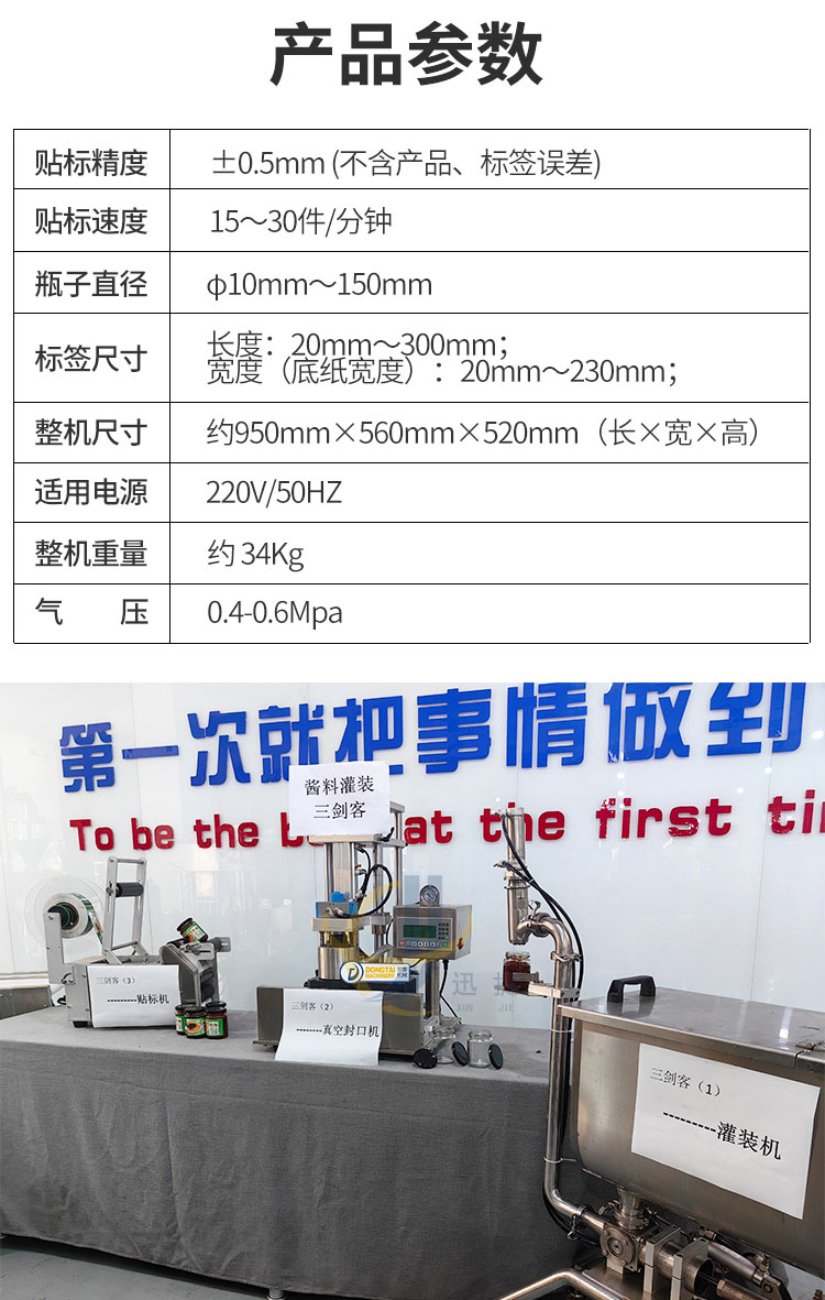 小型酱料灌装生产线又名酱料灌装三剑客,由半自动酱料灌装机+半自动真空旋盖机+半自动圆瓶贴标机组合而成。