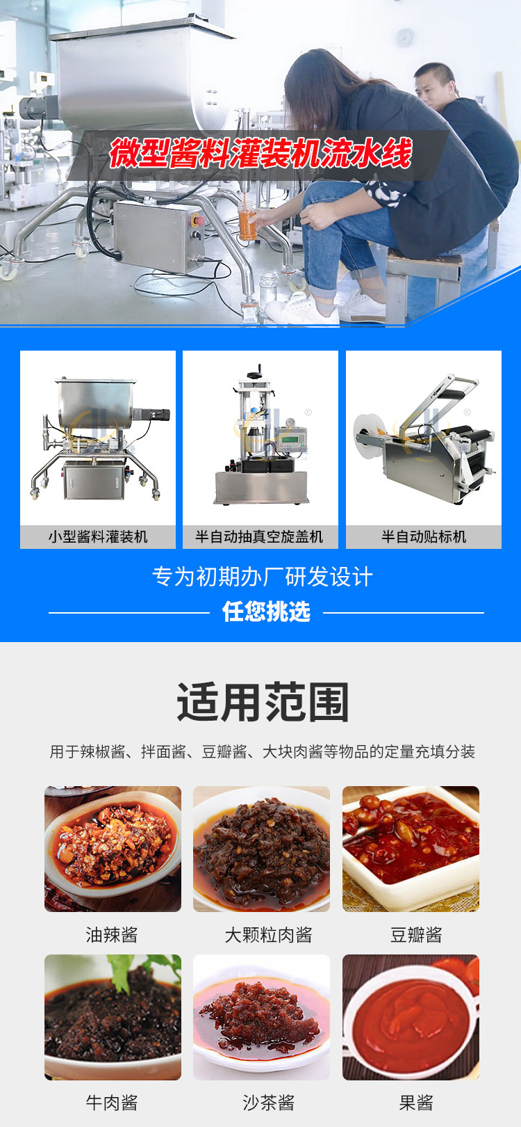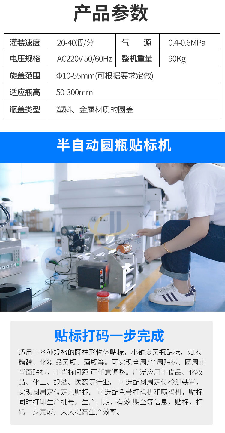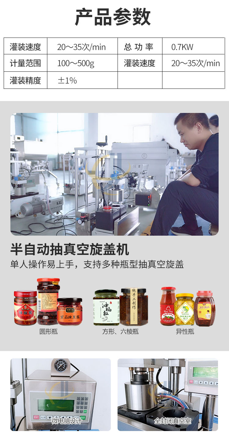 小型酱料灌装生产线又名酱料灌装三剑客,由半自动酱料灌装机+半自动真空旋盖机+半自动圆瓶贴标机组合而成。该灌装机适用于辣椒酱、豆瓣酱、大块肉酱等物品的定量充填分装。