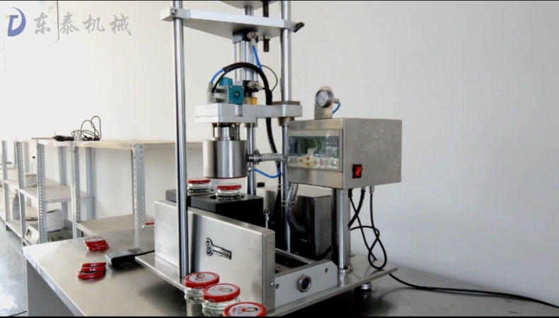 先从个词半自动来讲,半自动指的就是手动与机器相结合的操作流程:半自动玻璃瓶真空封口机是采用了人工上瓶,人工出瓶,机动旋盖与抽真空的方式来完成流程。由于人工上瓶,并且该半自动玻璃瓶真空旋盖机有无瓶不上盖,无瓶不抽真空的特点,所以大大减少了对瓶盖与瓶身的损害。并且人工与机器的配合丝毫不浪费时间,比纯手工的生产效率要几倍,还更节省人力,一台机器只需一个人便可轻松完成。