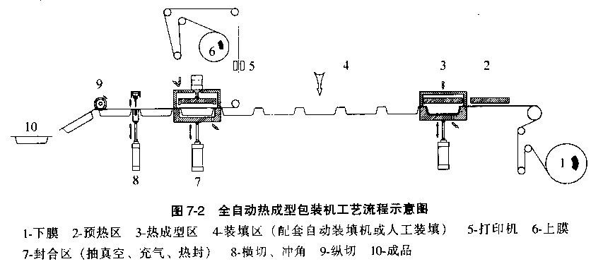 包装的全过税由机器自动完成,根据需要,装填可采用人工或机械实现。内流程图可见,下卷膜经牵引以定步距步进,经预热区及加热区,由气压、真空或冲模成型,在装填区填充物料后进入热封区。在热封区中,上卷膜经导辊后覆盖在成型盒上,视包装需要可进行抽真空或充入保护气体的处理,然后进行热压封合。后经横切、纵切及切角修边形成一个个美观的包装成品。至于经裁切后的边料可由抽吸捅或卷扬装置收集和清理。